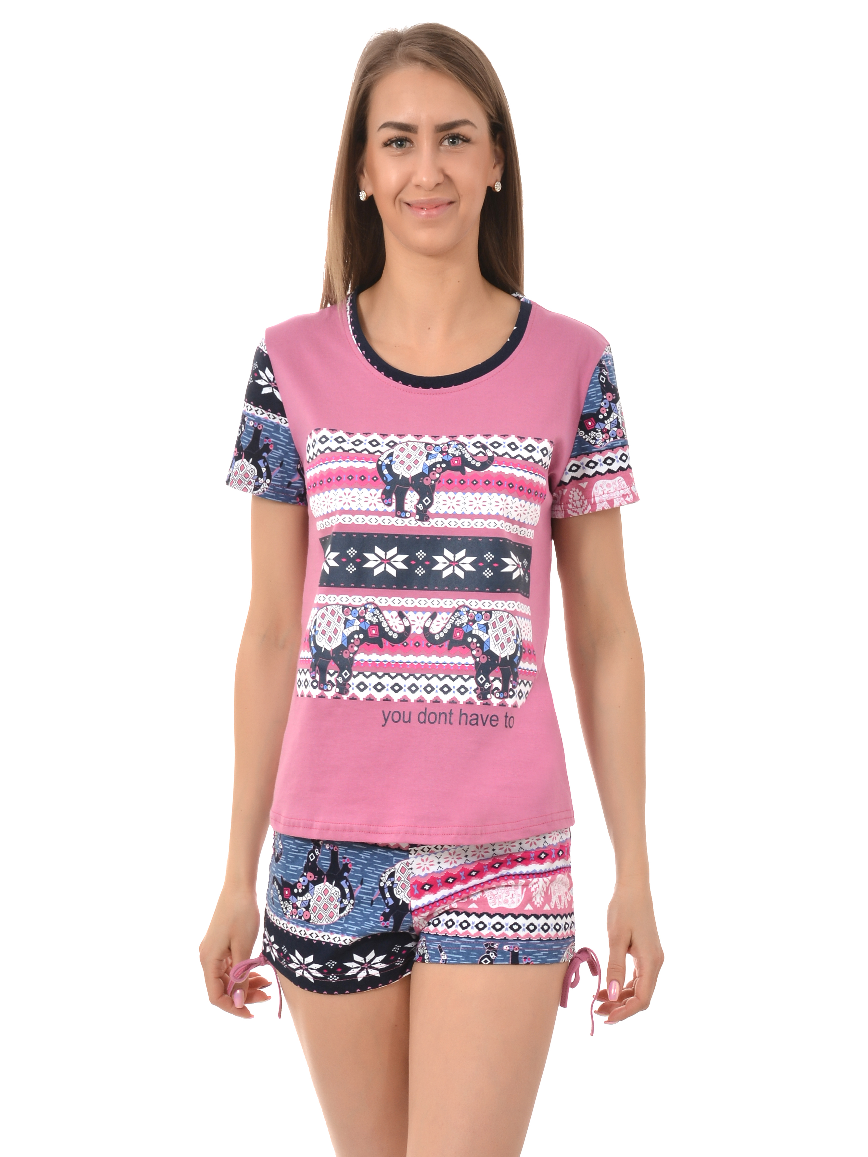 Подари себе уют и красоту! Верх пижамы - футболка с короткими рукавами и круглым вырезом горловины. Спереди интересный принт. Низ - свободные шортики с завязками по бокам. Мягкий хлопковый материал, комфортный в носке. Рисунок нанесённый методом шелкографии, не состирывается и не выгорает. Гладить с изнаночной стороны.