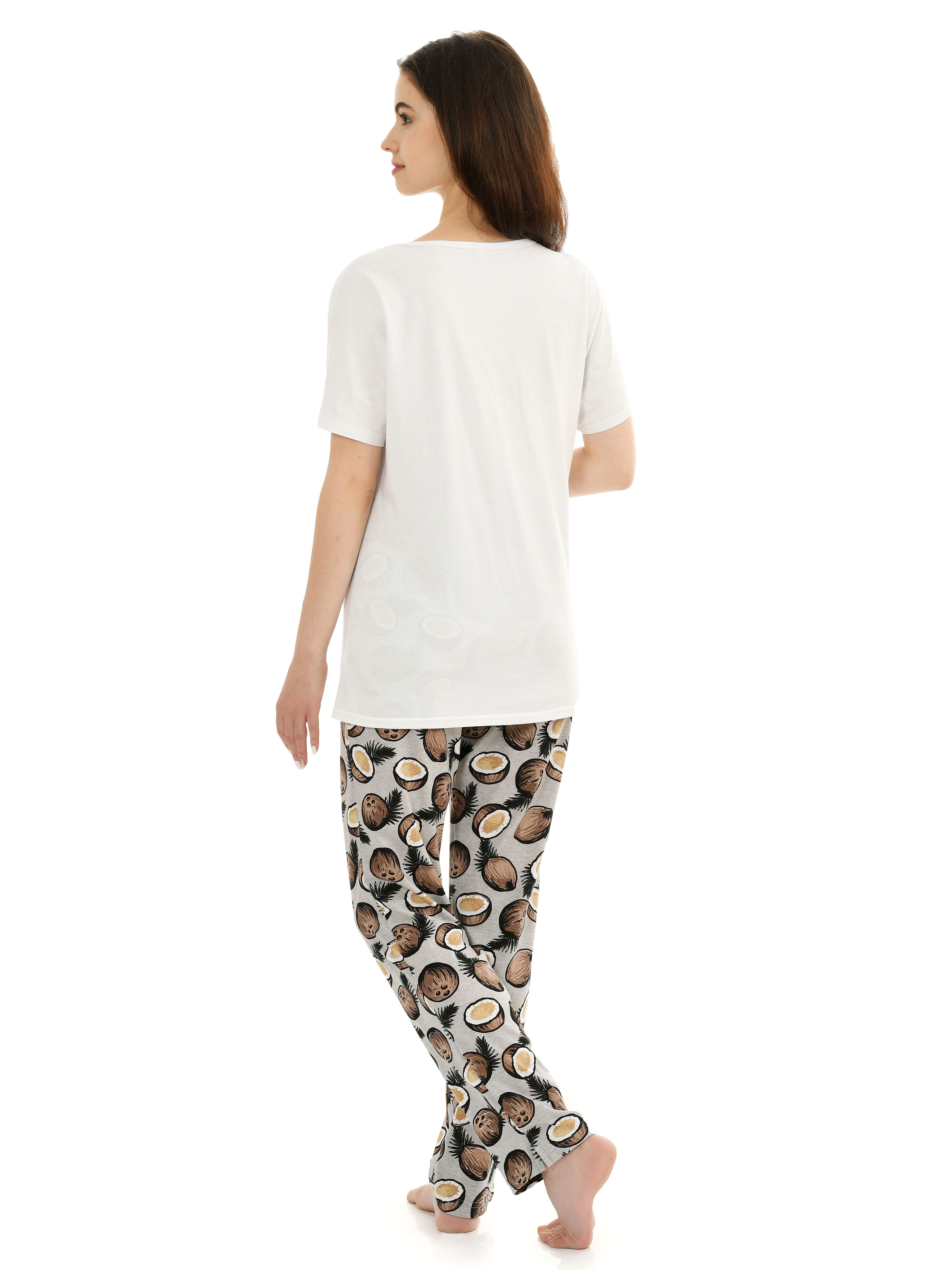 Мягкая хлопковая пижама от торговой марки "Slaff". Верх пижамы - футболка с короткими рукавами и круглым вырезом горловины. Спереди интересный принт - кокосы. Низ - свободные брюки с рисунком кокосы. Мягкий хлопковый материал, комфортный в носке. Рисунок нанесённый методом шелкографии, не состирывается и не выгорает. Гладить с изнаночной стороны.