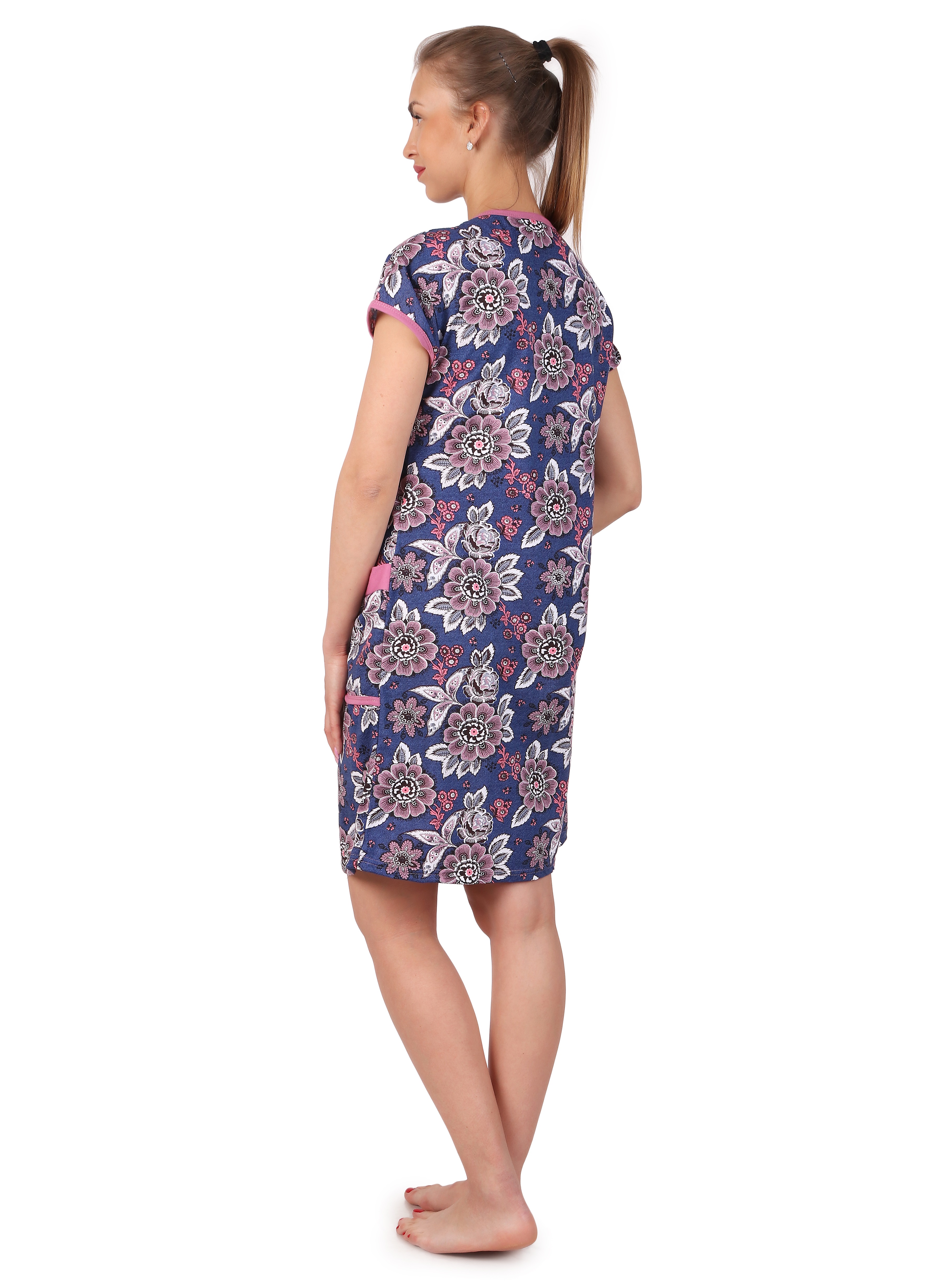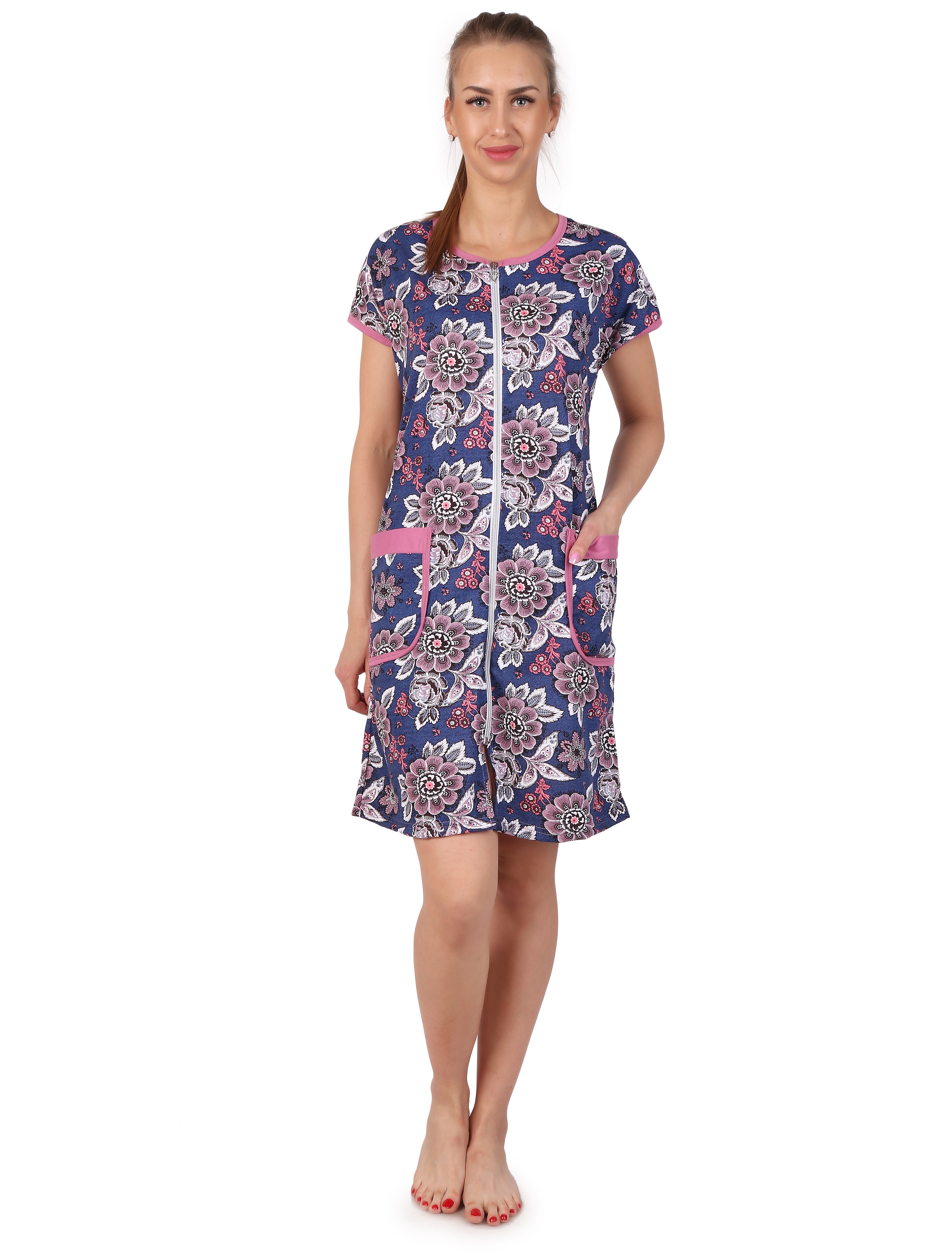 Яркий цветочный рисунок, короткий рукав, контрастная окантовка горловины и боковых карманов, застежка на молнии, оптимальная длина до колен.