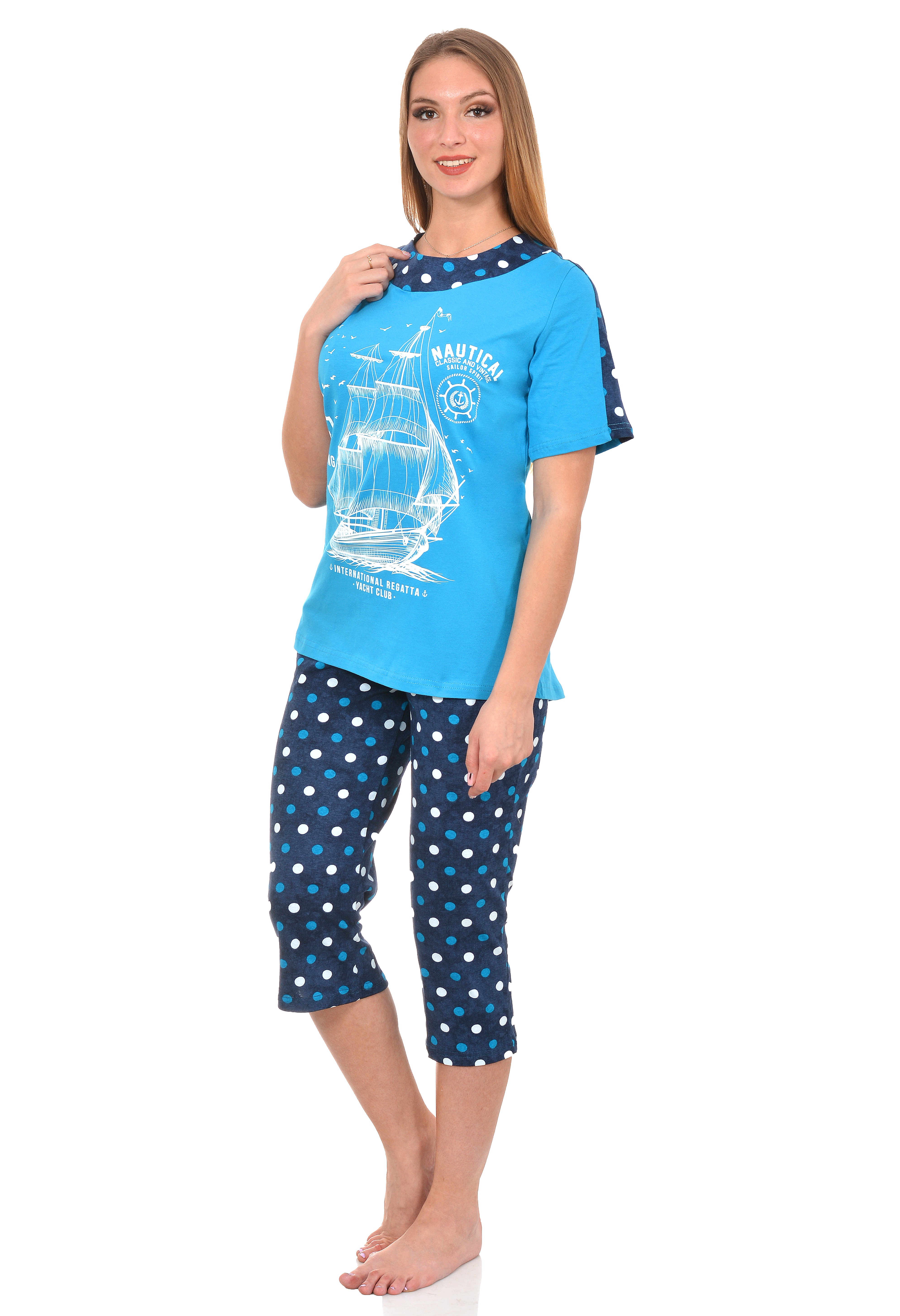 Практичный костюм из мягкого трикотажа состоит из бридж и футболки. Приятен и комфортен в использовании. Благодаря сбалансированному крою костюм отлично сидит на фигуре любого типа. Футболка имеет широкую обтачку на горловине в цвет бридж и рисунок с морской тематикой. Бриджи прямые, умеренно свободной формы. Эта модель отлично подойдет для дачи, города, а также будет хорошо смотреться на отдыхе – в любом месте вы будете выглядеть оригинально и красиво.