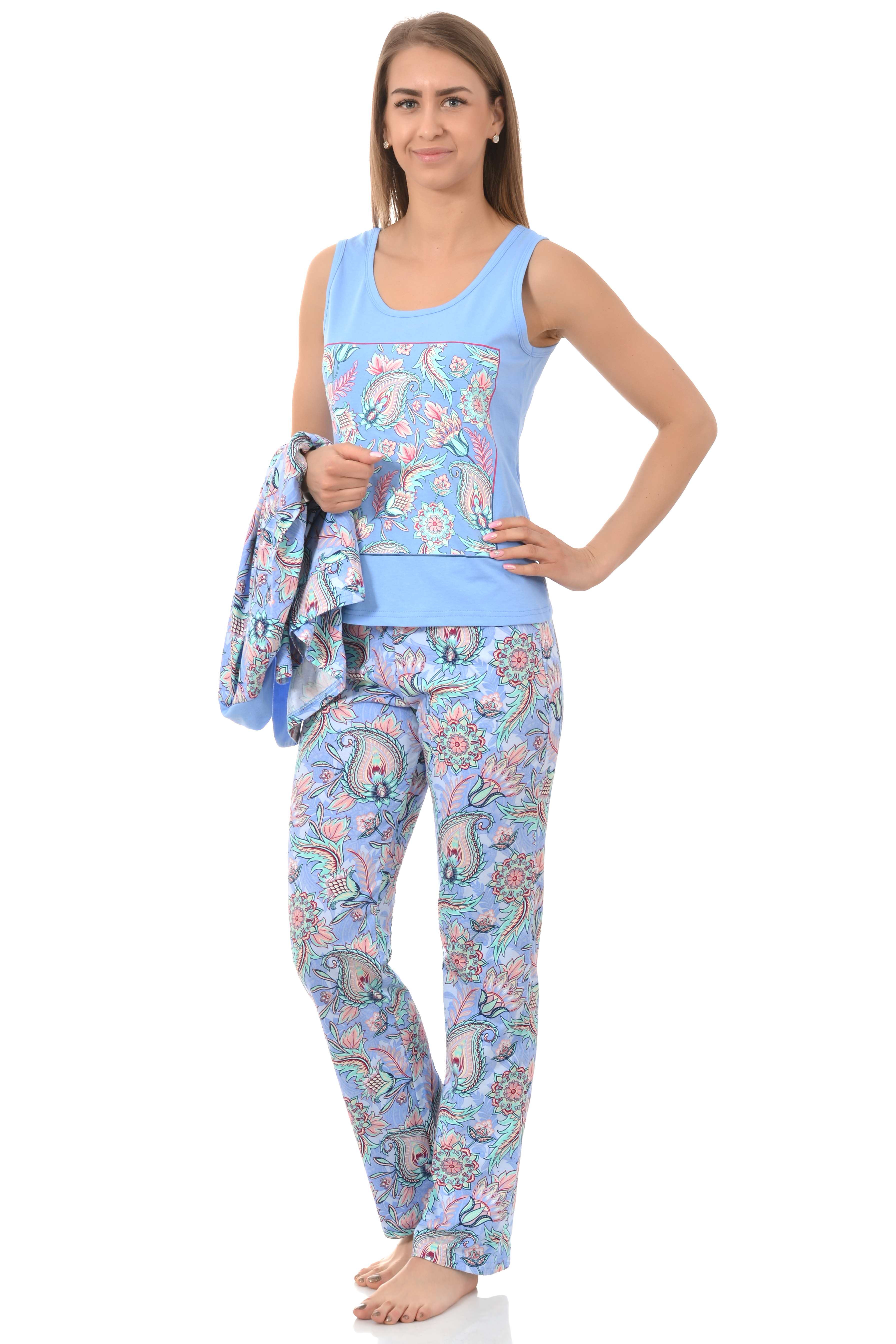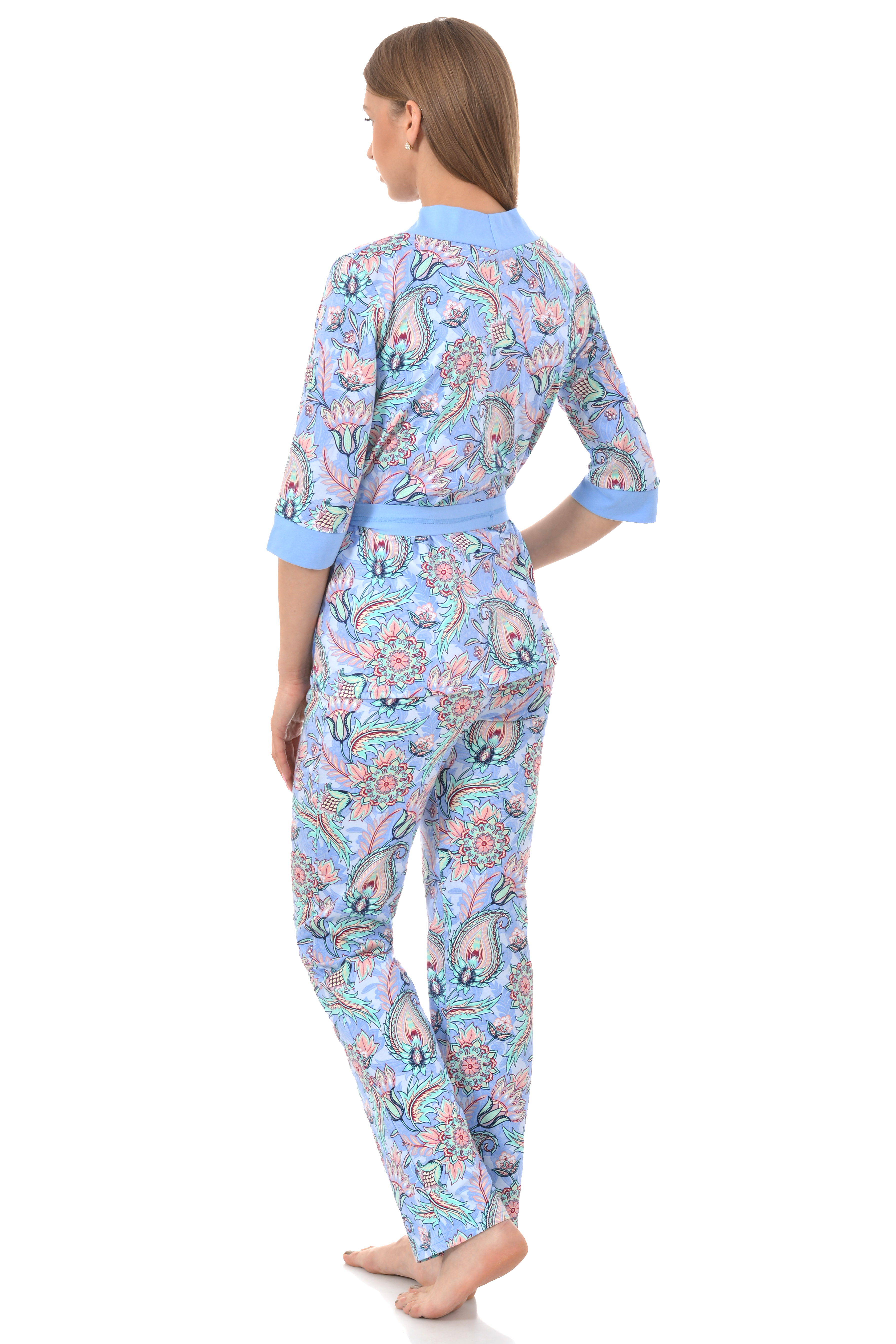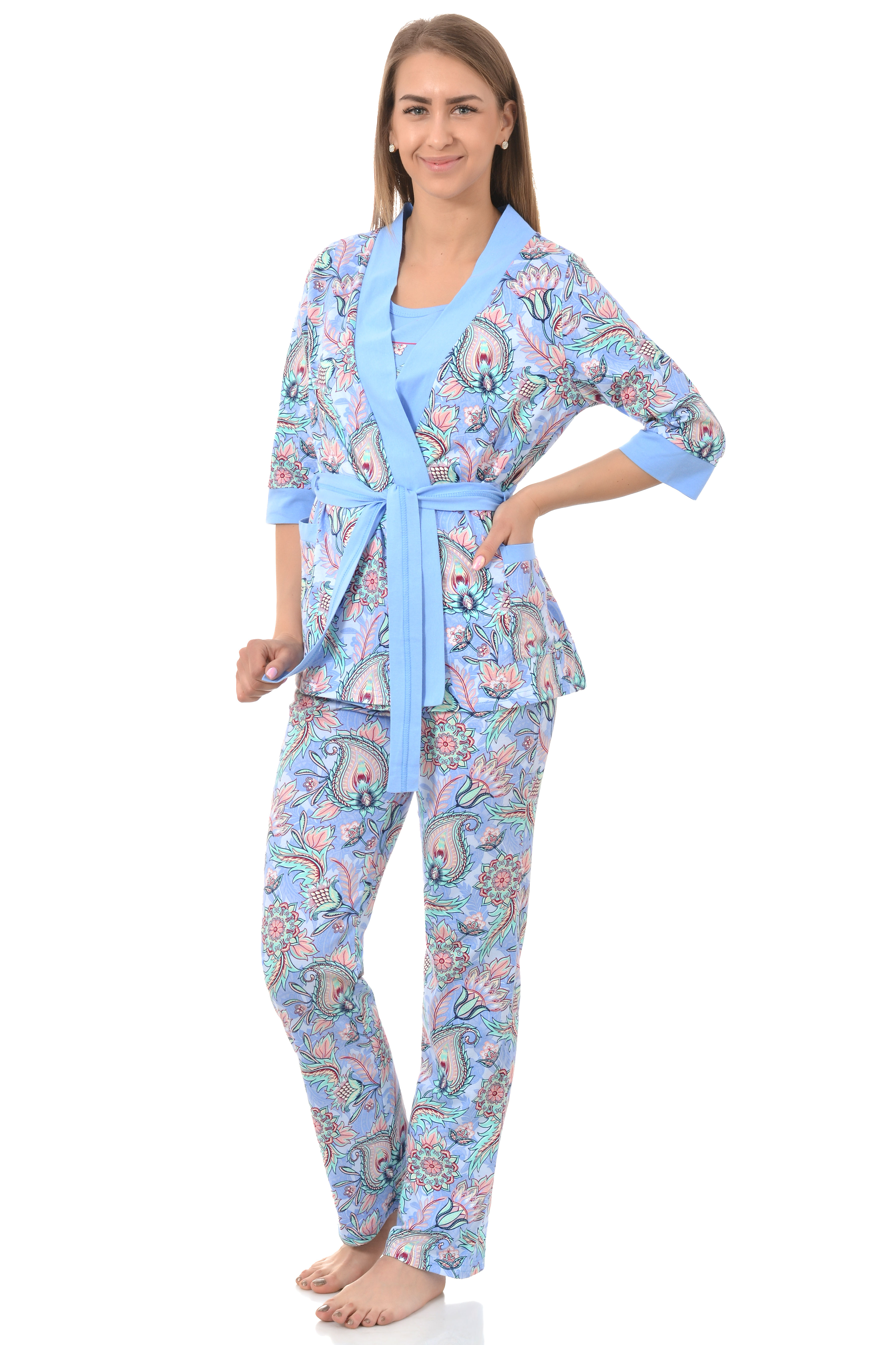 Симпатичный домашний комплект из брюк, маечки и пеньюара позволит выглядеть любой девушке на все 100 даже дома.