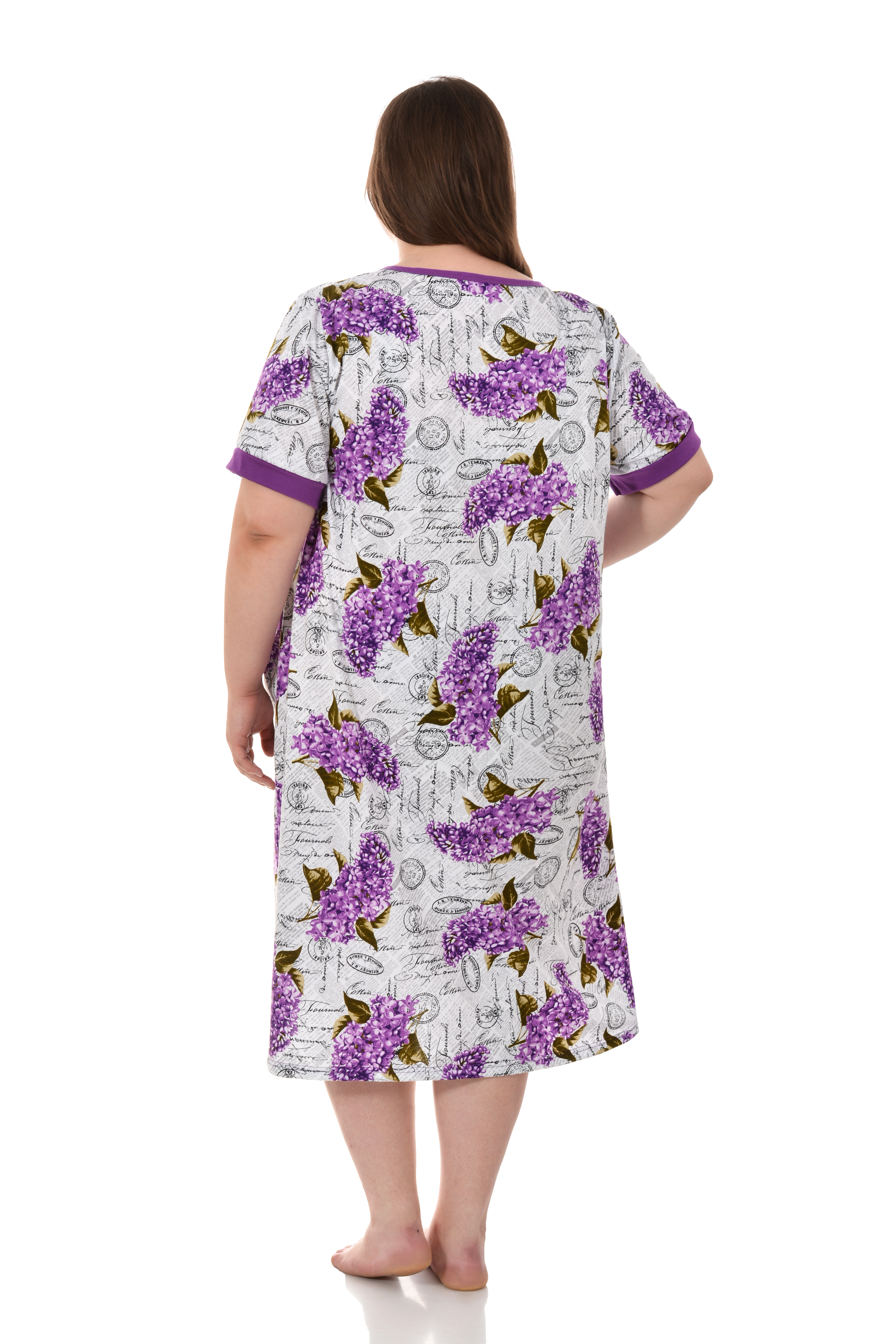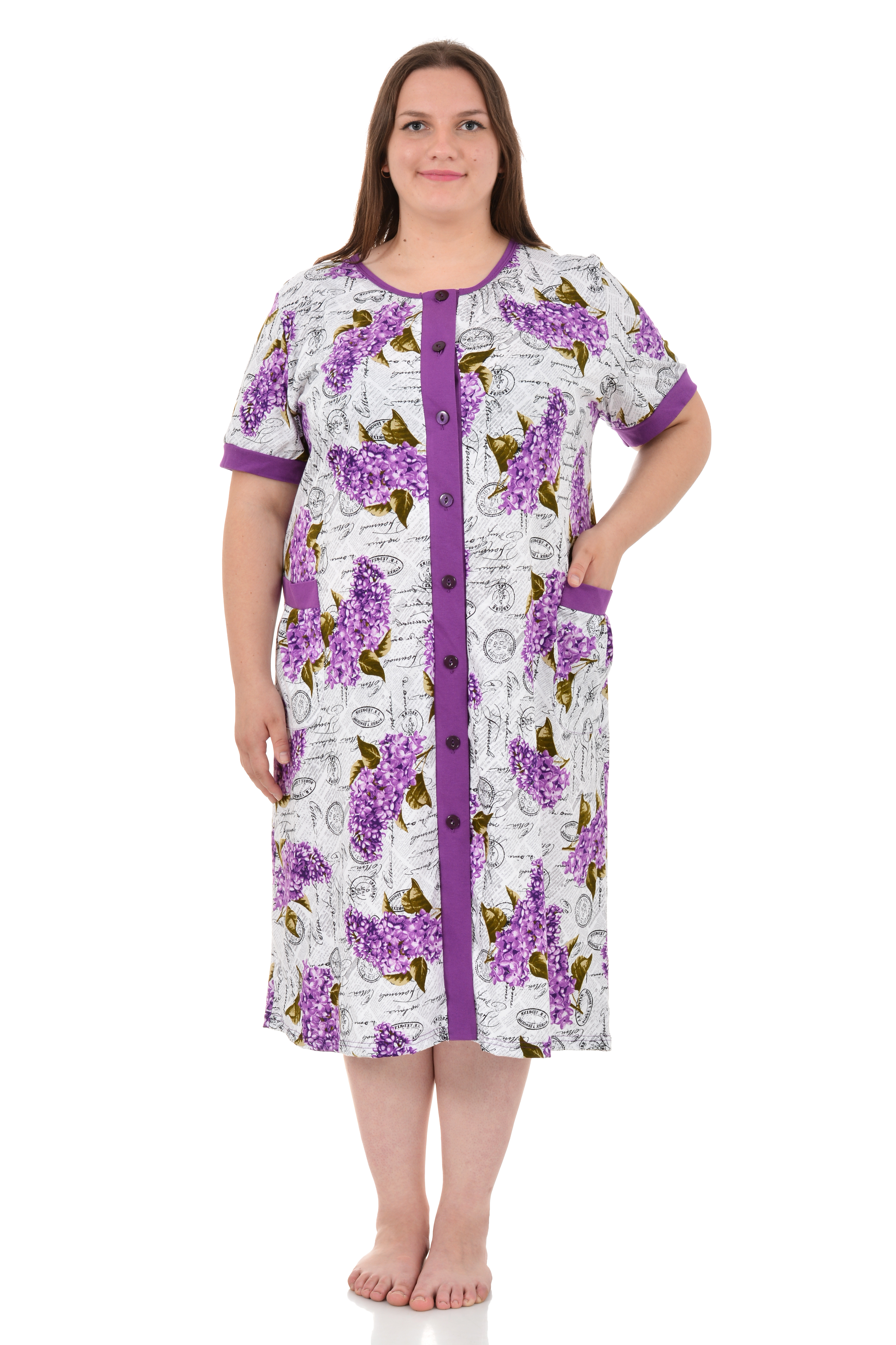 Удобный хлопковый халат отлично сидит на фигуре любого типа. Овальный вырез горловины, прямой крой, цветочный узор, большие удобные карманы, застежка на пуговицах, оптимальная длина до колена.