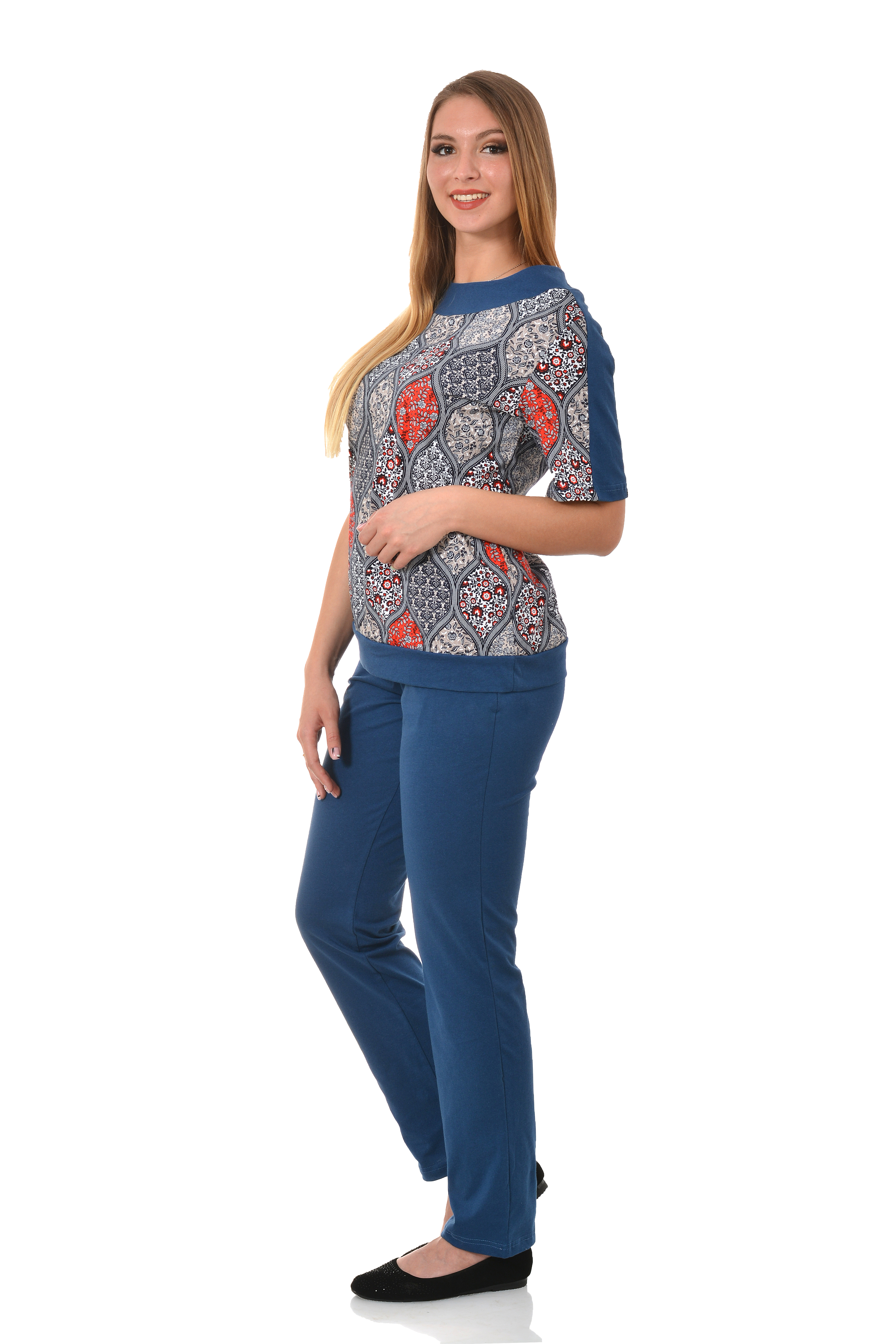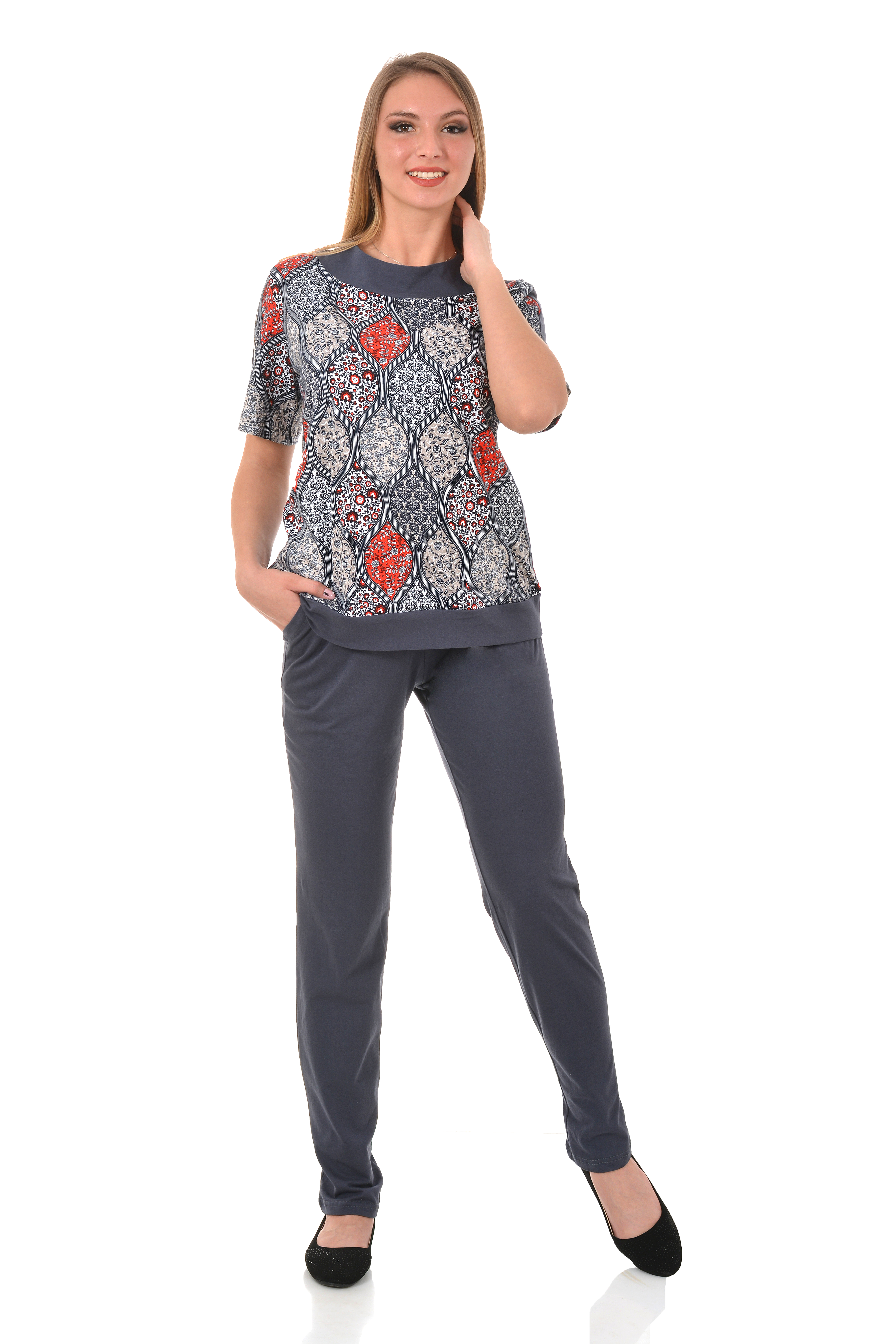 Современный брючный костюм из мягкого гладкокрашеного хлопкового трикотажа.
