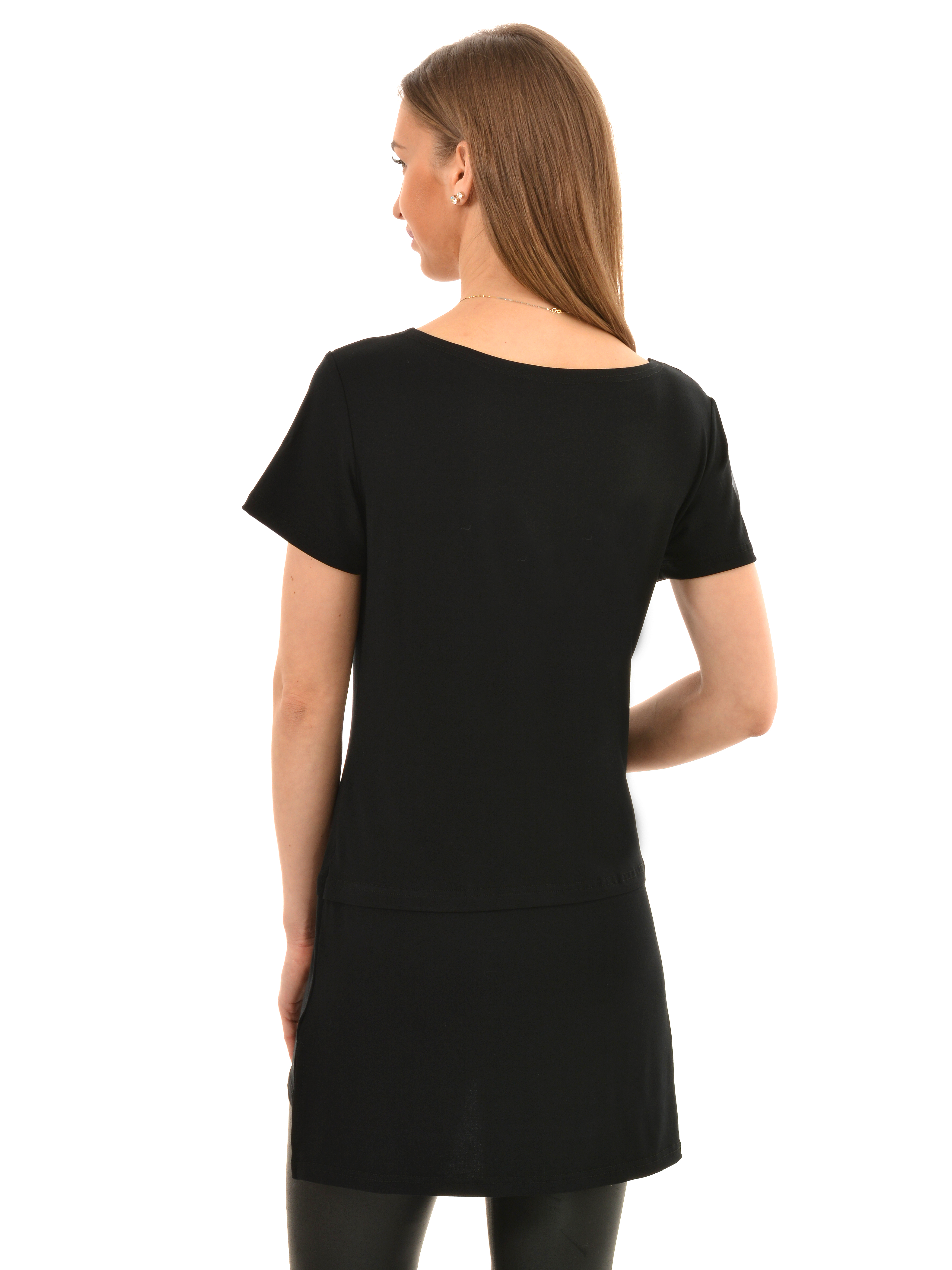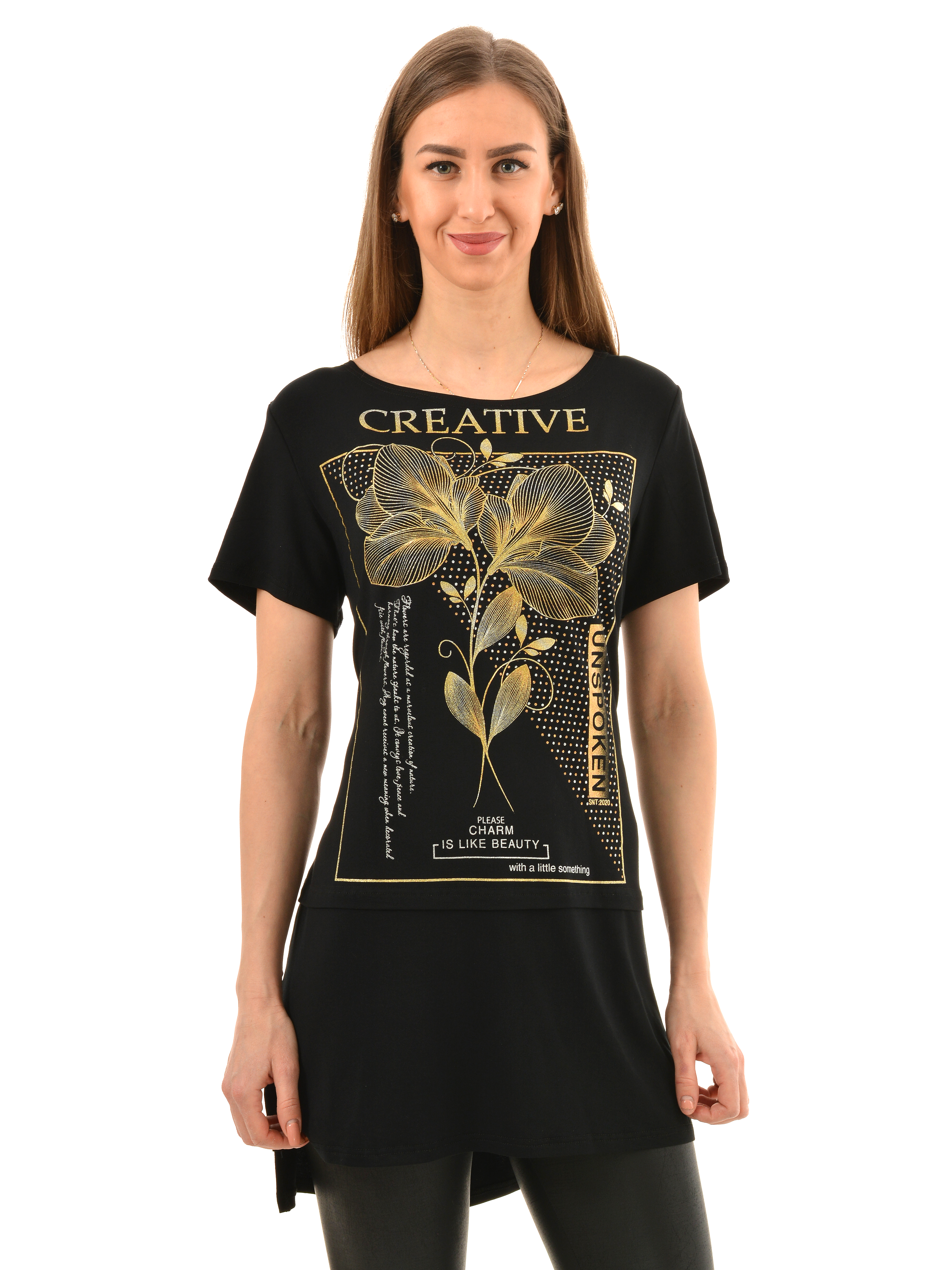 Стильная туника с золотистым рисунком подчеркнет вашу женственность и добавит изюминку в повседневный образ. Круглый вырез горловины, короткий рукав, прямой покрой. Туника идеально сочетается с джинсами, брюками и некоторыми юбками. Можно носить как летом и весной, так и в холодное время года с верхней одеждой. Рисунок нанесённый методом шелкографии, не состирывается и не выгорает. Гладить с изнаночной стороны.