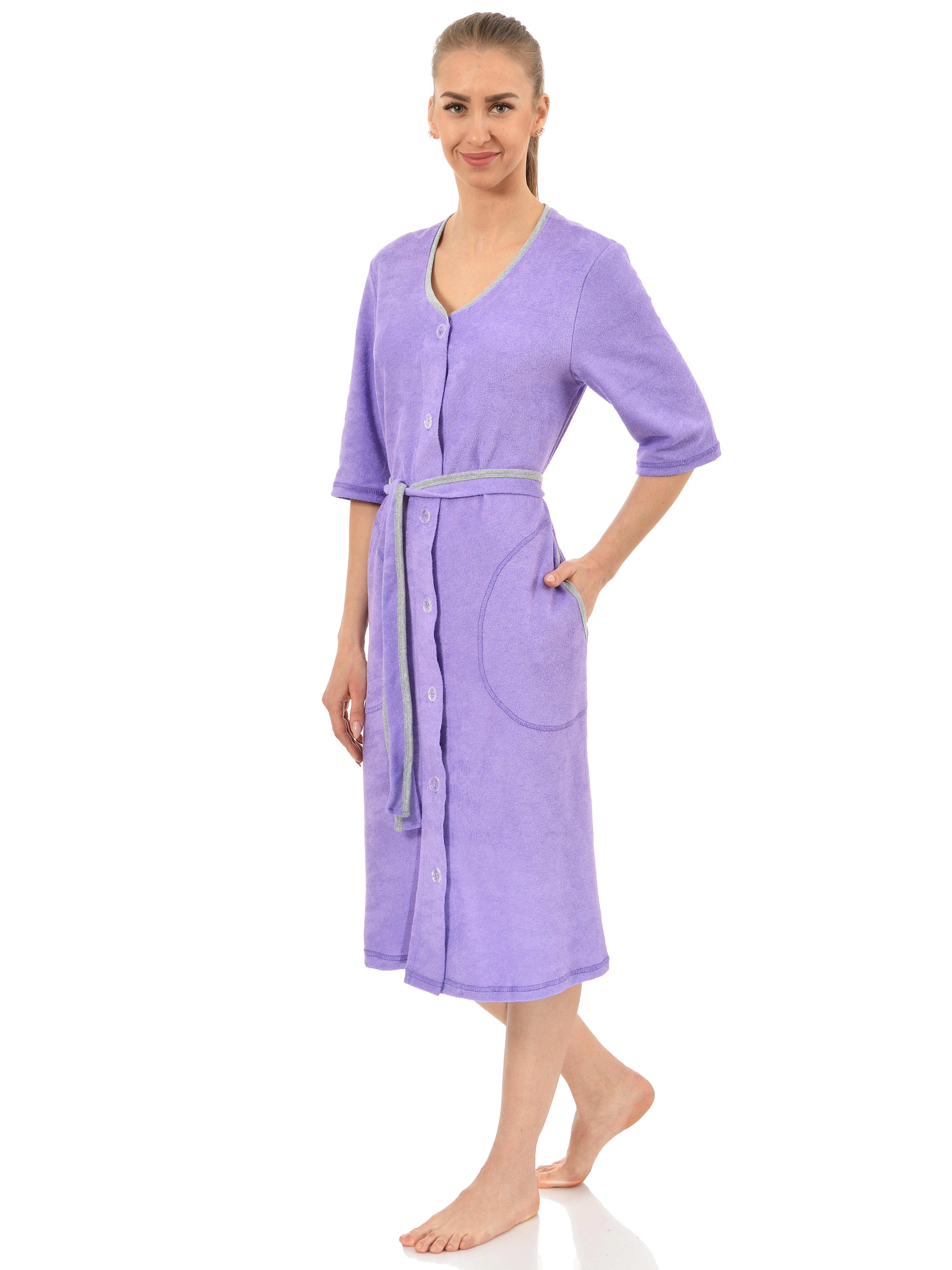 Мягкий махровый халат на пуговицах. Два больших удобных кармана, пояс, подчеркивающий талию, рукава 1/2, длина чуть ниже колена (при росте 170 см). Сочетание удобства и утонченности. Махровая ткань гипоаллергенна, хорошо сохраняет тепло, долговечна в носке. Халат отлично подойдет в период межсезонья, в нем вы будете чувствовать себя уютно и комфортно!