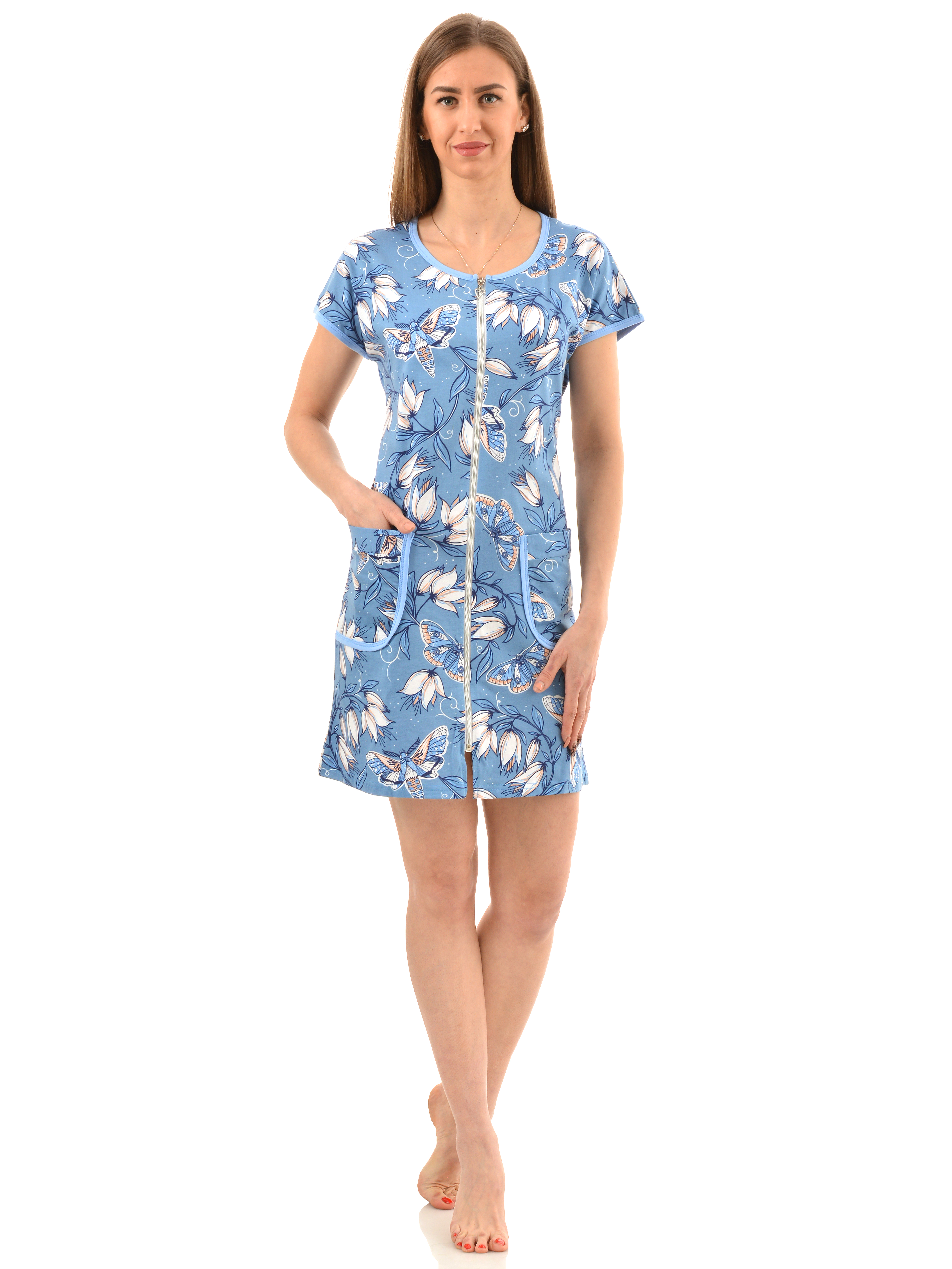 Короткий рукав, контрастная окантовка горловины и боковых карманов, застежка на молнии, оптимальная длина до колен.
