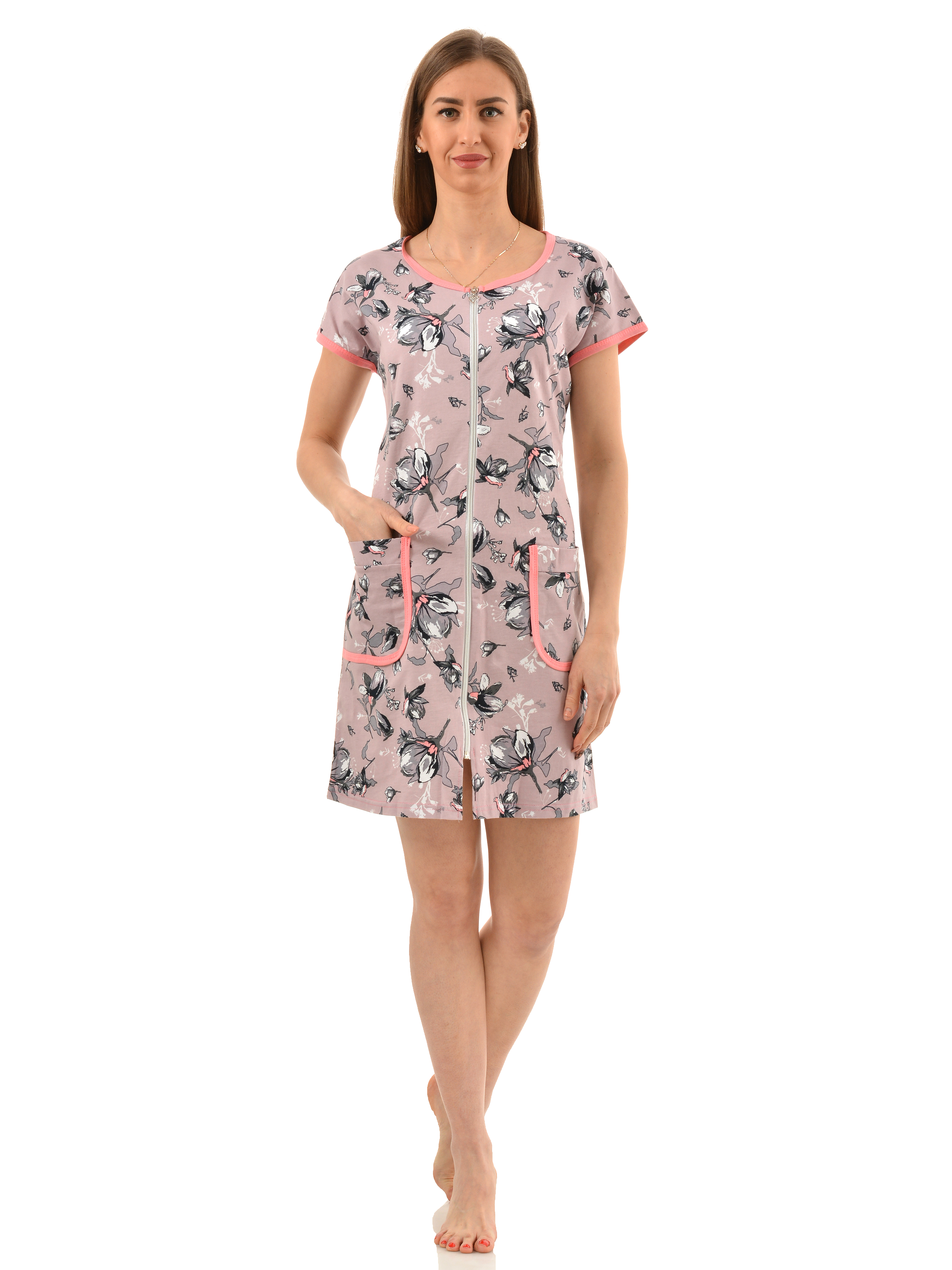 Короткий рукав, контрастная окантовка горловины и боковых карманов, застежка на молнии, оптимальная длина до колен.