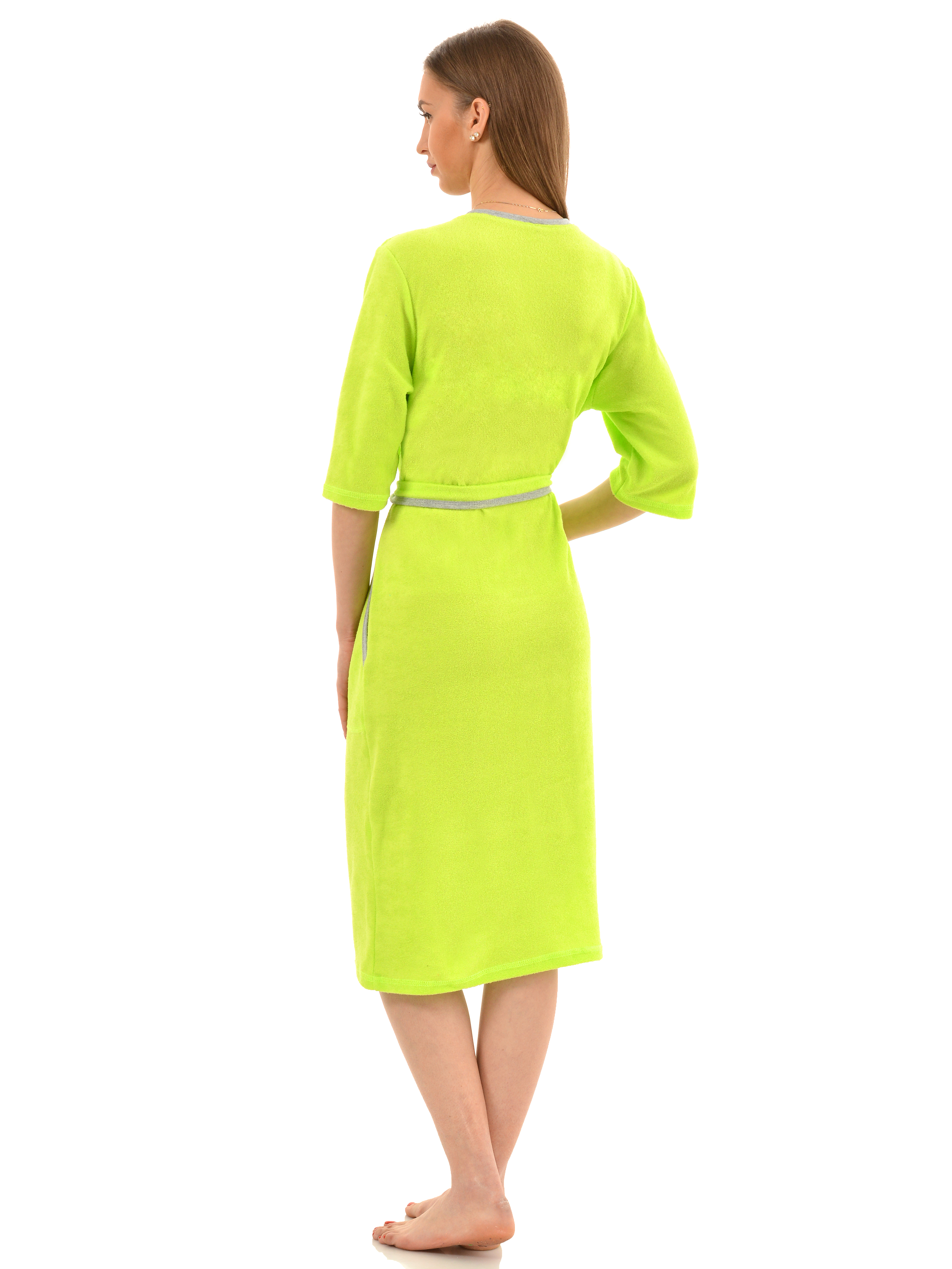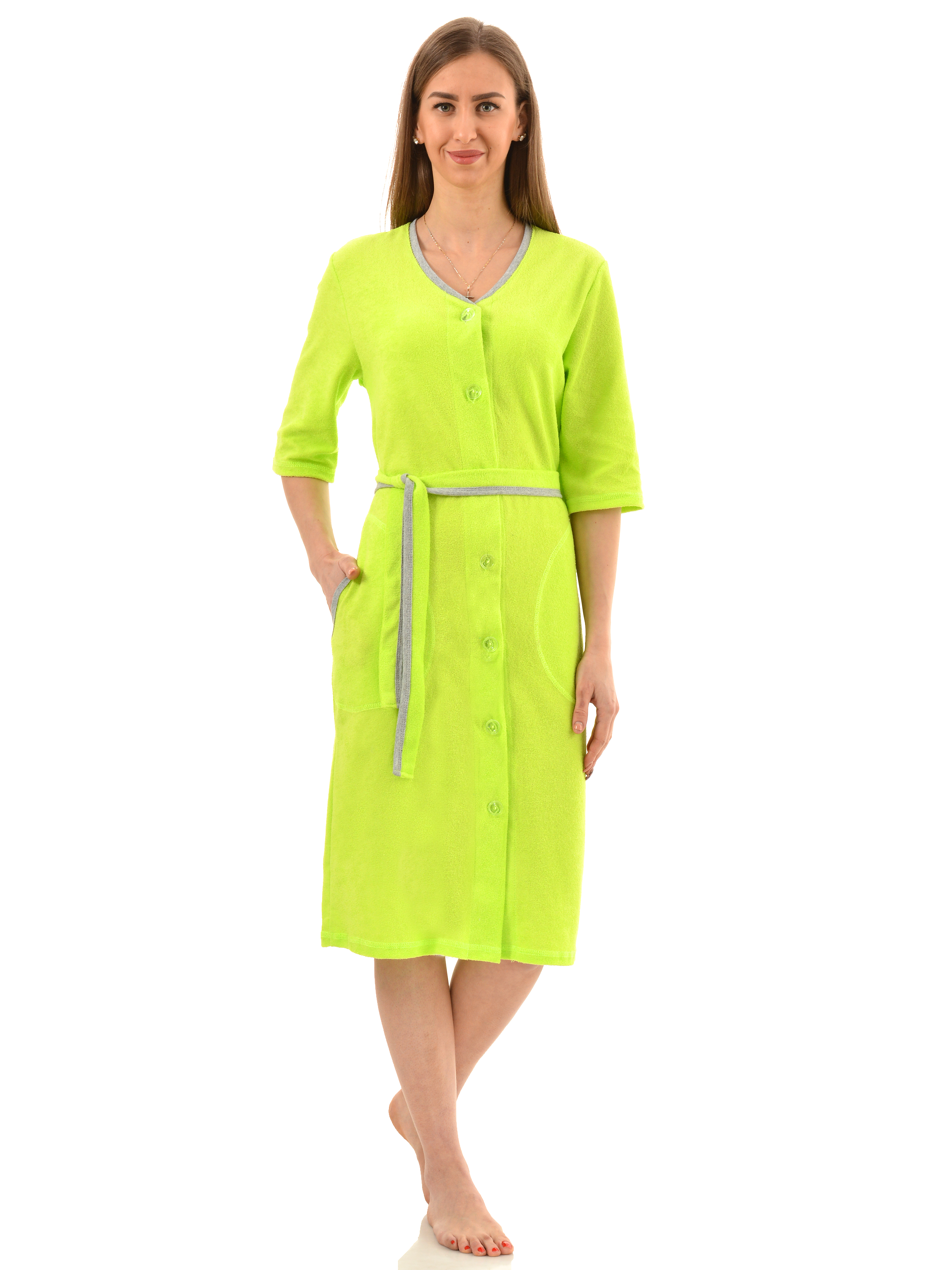 Мягкий махровый халат на пуговицах. Два больших удобных кармана, пояс, подчеркивающий талию, рукава 1/2, длина чуть ниже колена (при росте 170 см). Сочетание удобства и утонченности. Махровая ткань гипоаллергенна, хорошо сохраняет тепло, долговечна в носке. Халат отлично подойдет в период межсезонья, в нем вы будете чувствовать себя уютно и комфортно!