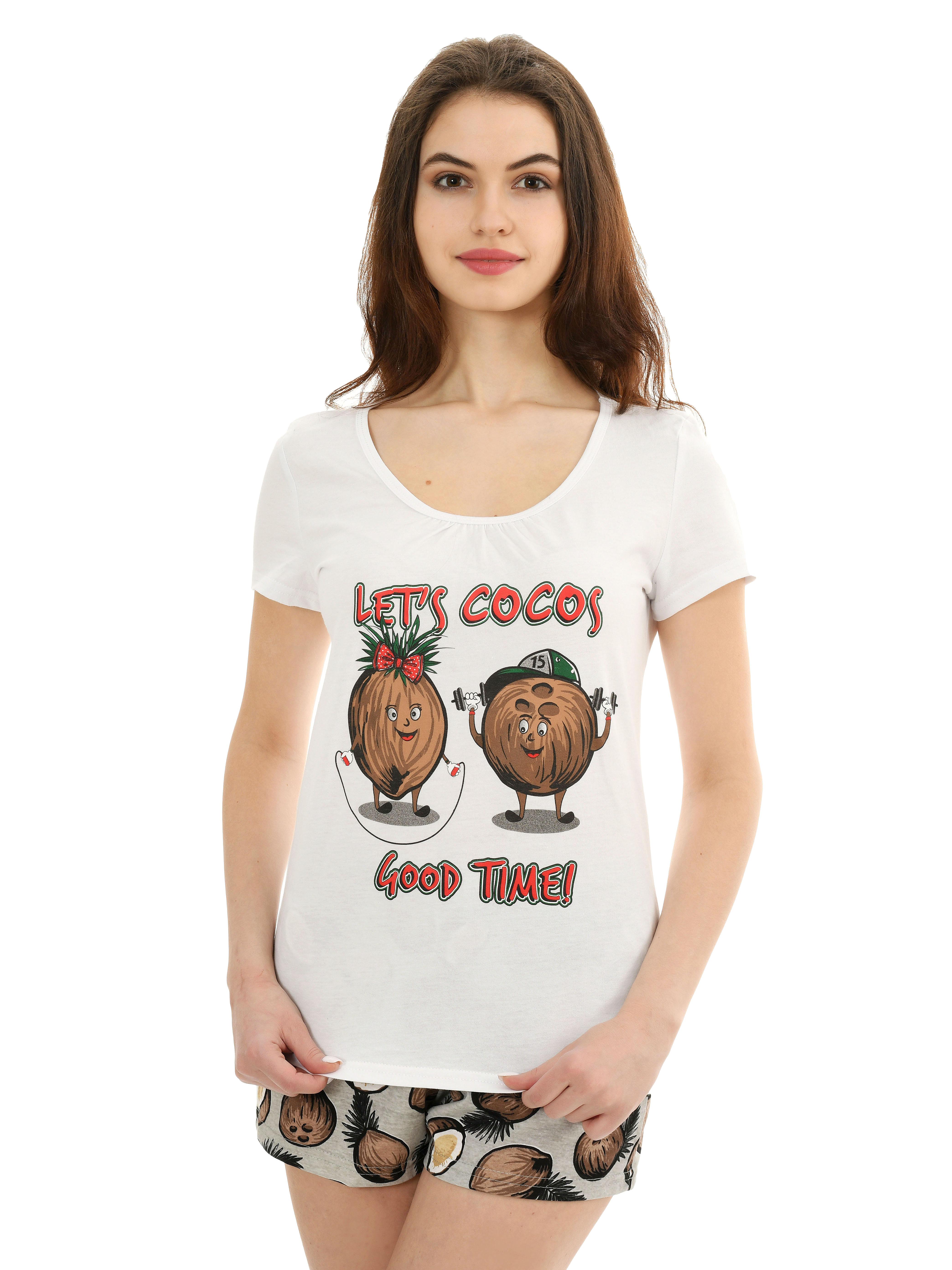 Мягкая хлопковая пижама от торговой марки "Slaff". Верх пижамы - футболка с короткими рукавами и круглым вырезом горловины. Спереди интересный принт - кокосы. Низ - свободные шортики с рисунком кокосы. Мягкий хлопковый материал, комфортный в носке. Рисунок нанесённый методом шелкографии, не состирывается и не выгорает. Гладить с изнаночной стороны.
