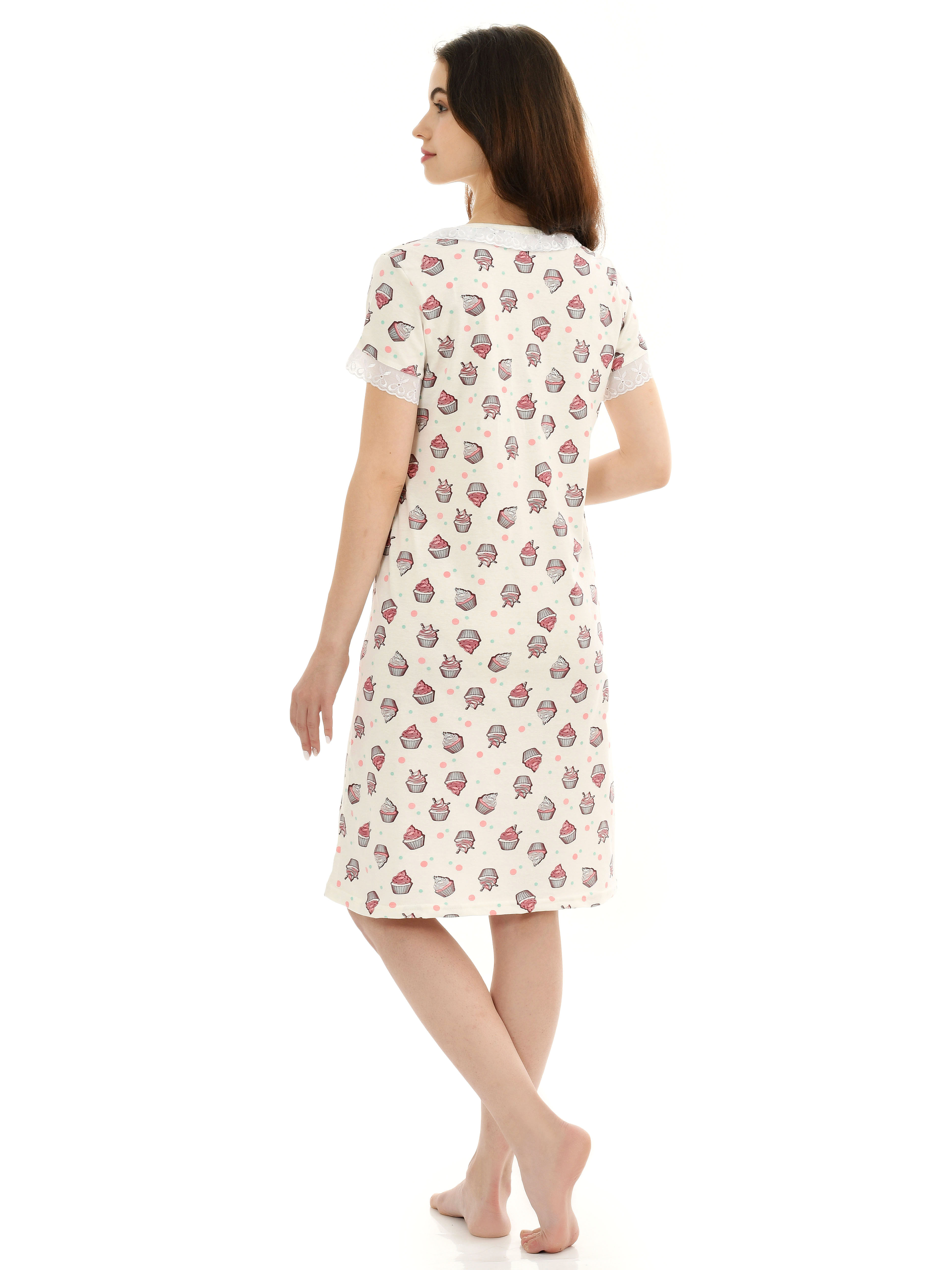 В этой симпатичной ночной сорочке вам будут сниться только добрые сны! Сорочка привлекает своим чувственным дизайном и нежным материалом. Материал из чистого хлопка и слегка расклешенный силуэт позаботятся о необходимом комфорте. V-образный вырез, свободные короткие рукава с кружевом добавляют нотку романтики и игривости. Модель свободного покроя не сковывает движений, а приятный к телу материал дарит чувство неги и уюта.