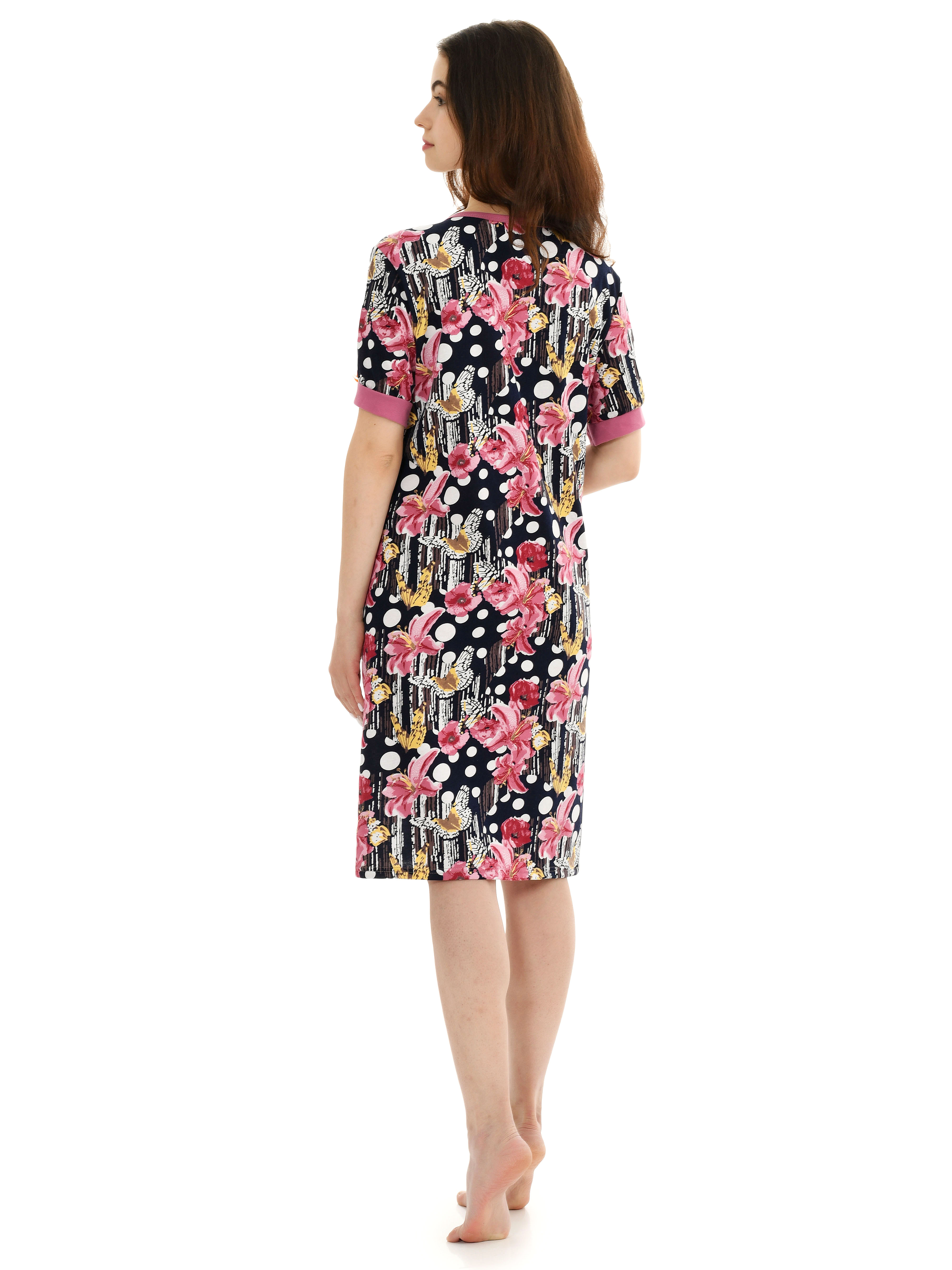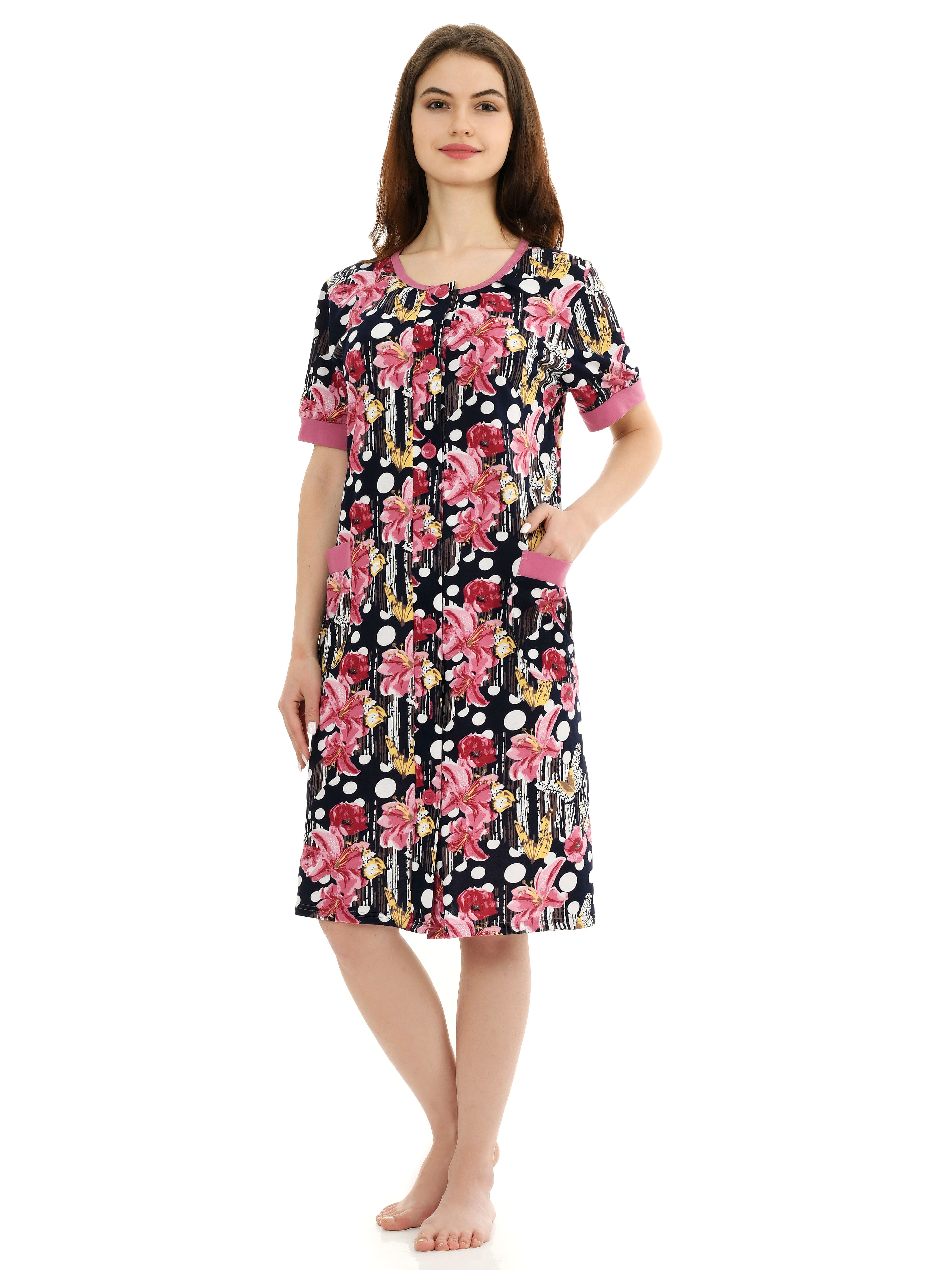 Пестрый рисунок, короткий рукав, удобные карманы, застежка на пуговицах и хлопковая ткань делает это халат идеальным вариантом домашней одежды. При производстве используются только качественные материалы, пошив ведется на современном оборудовании, все швы ровные и аккуратно обработаны, благодаря чему изделие будет носиться очень долго.