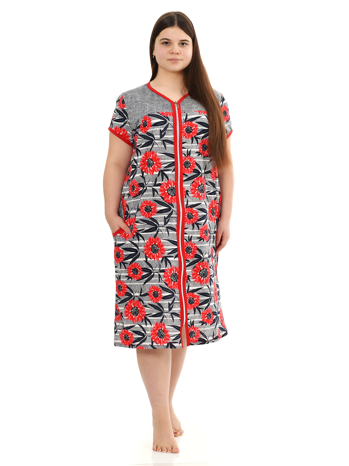 Пестрый рисунок, короткий рукав, удобные карманы, застежка на молнии и хлопковая ткань делает это халат идеальным вариантом домашней одежды. При производстве используются только качественные материалы, пошив ведется на современном оборудовании, все швы ровные и аккуратно обработаны, благодаря чему изделие будет носиться очень долго. При стирке соблюдайте условия по уходу - температура воды не более 40 градусов, не сушить в сушильном барабане.