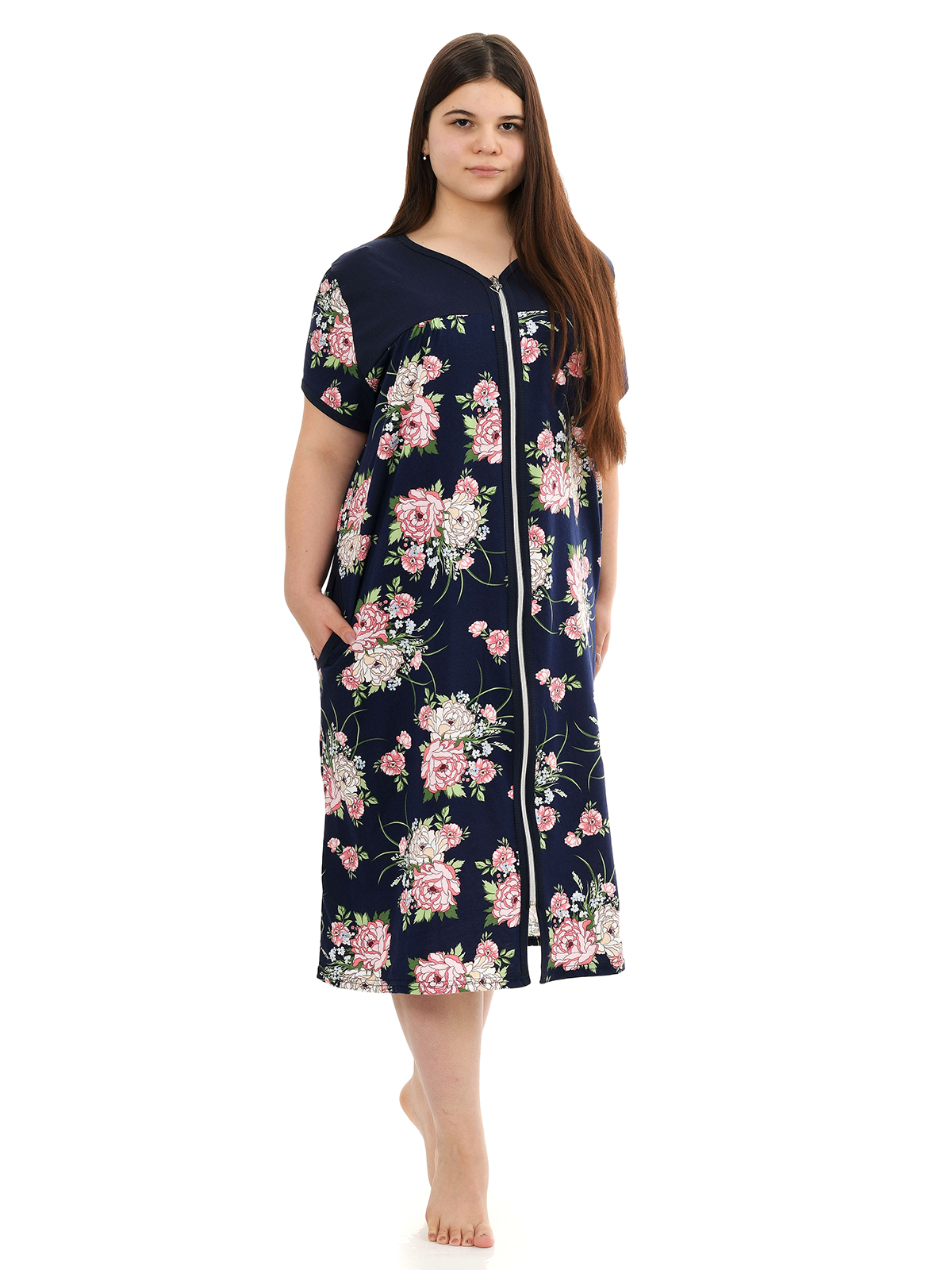Пестрый рисунок, короткий рукав, удобные карманы, застежка на молнии и хлопковая ткань делает это халат идеальным вариантом домашней одежды. При производстве используются только качественные материалы, пошив ведется на современном оборудовании, все швы ровные и аккуратно обработаны, благодаря чему изделие будет носиться очень долго. При стирке соблюдайте условия по уходу - температура воды не более 40 градусов, не сушить в сушильном барабане.