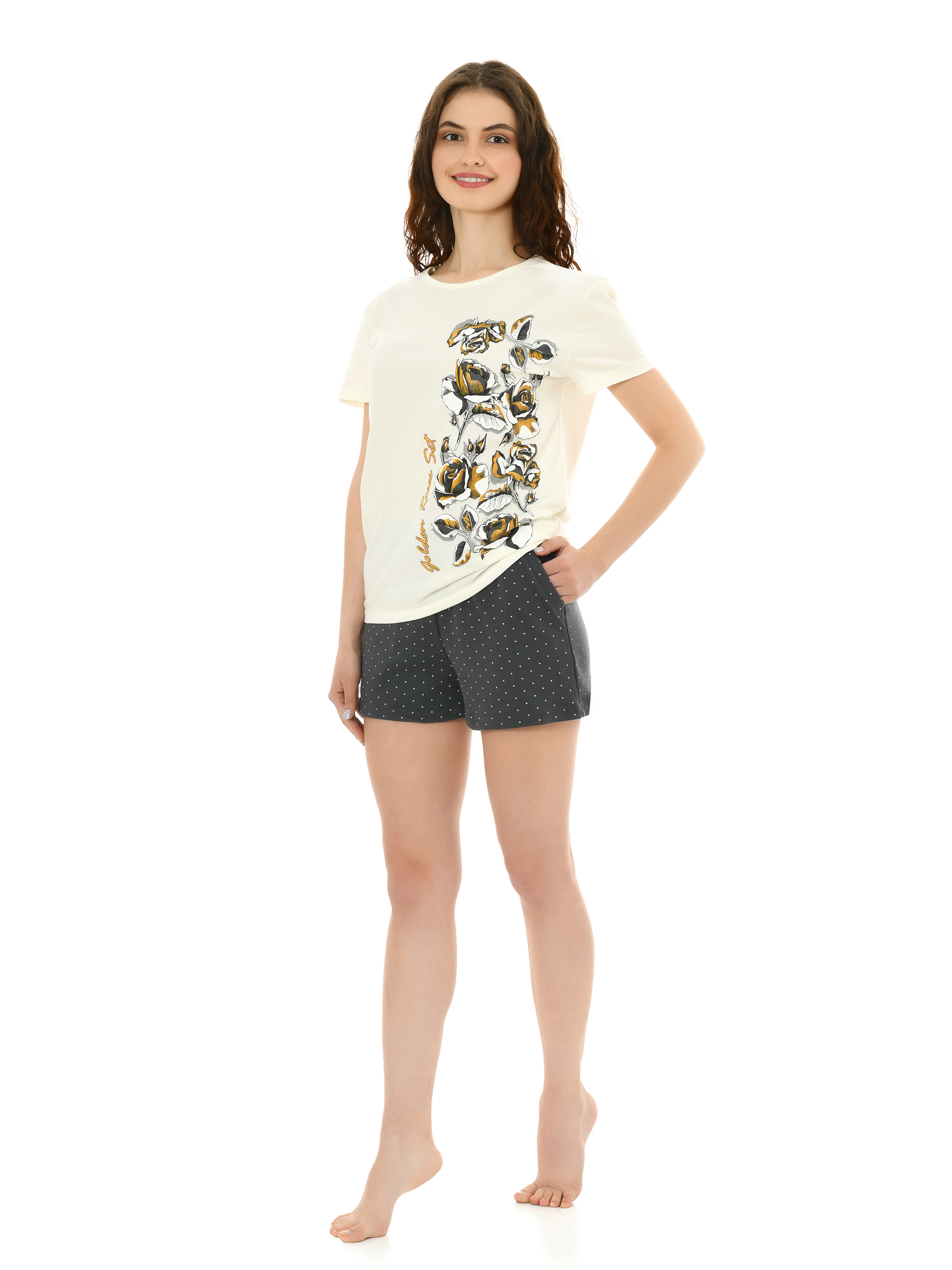 Хлопковая пижама/костюм от торговой марки "Slaff". Верх пижамы - футболка с короткими рукавами и круглым вырезом горловины. Спереди интересный принт - розочки. Низ - свободные шортики в горох. Мягкий хлопковый материал, комфортный в носке. Рисунок нанесённый методом шелкографии, не состирывается и не выгорает. Гладить с изнаночной стороны. Соблюдайте рекомендации по уходу (машинная стирка при температуре не выше 40 градусов, не сушить в сушильном барабане).