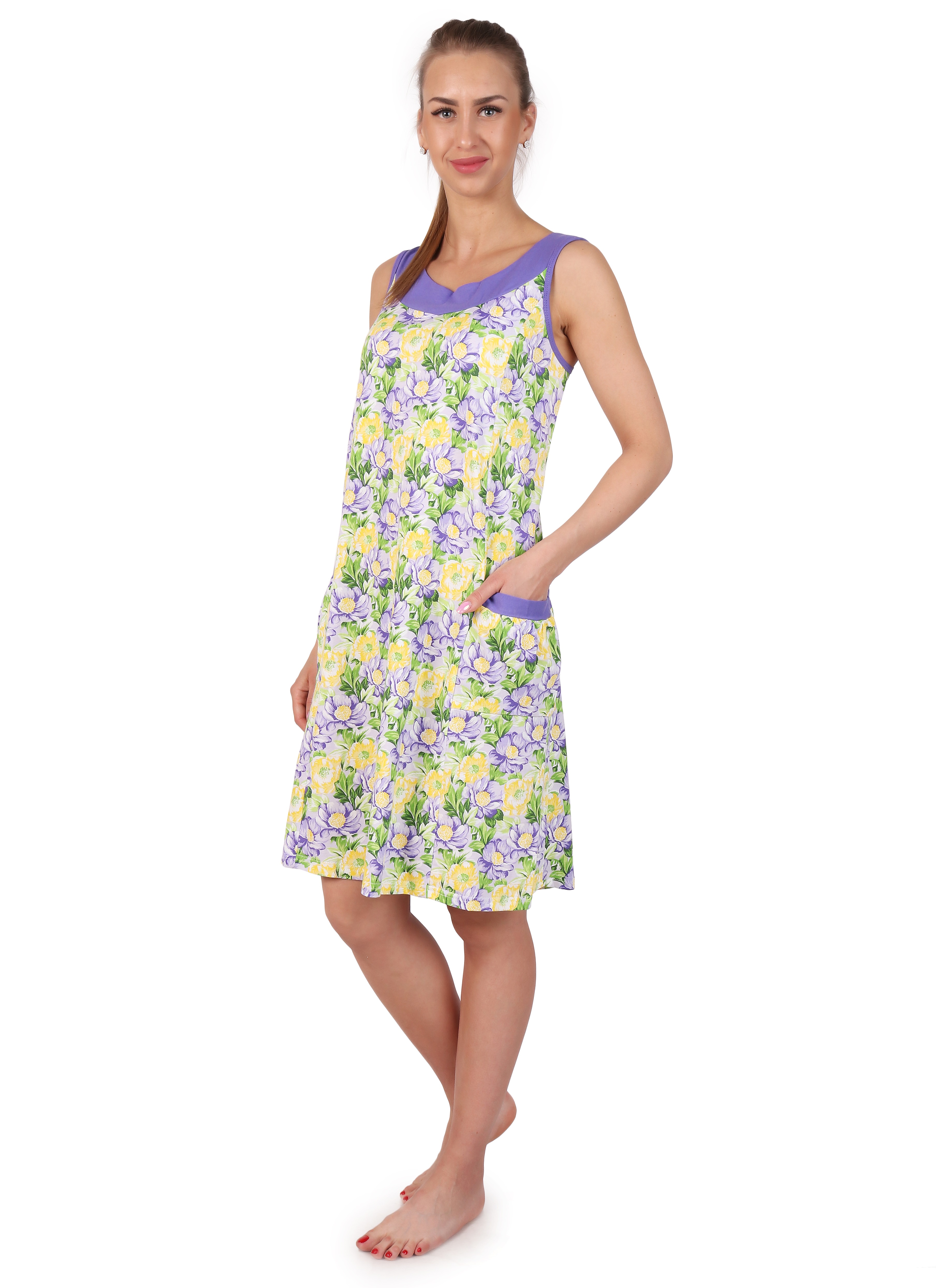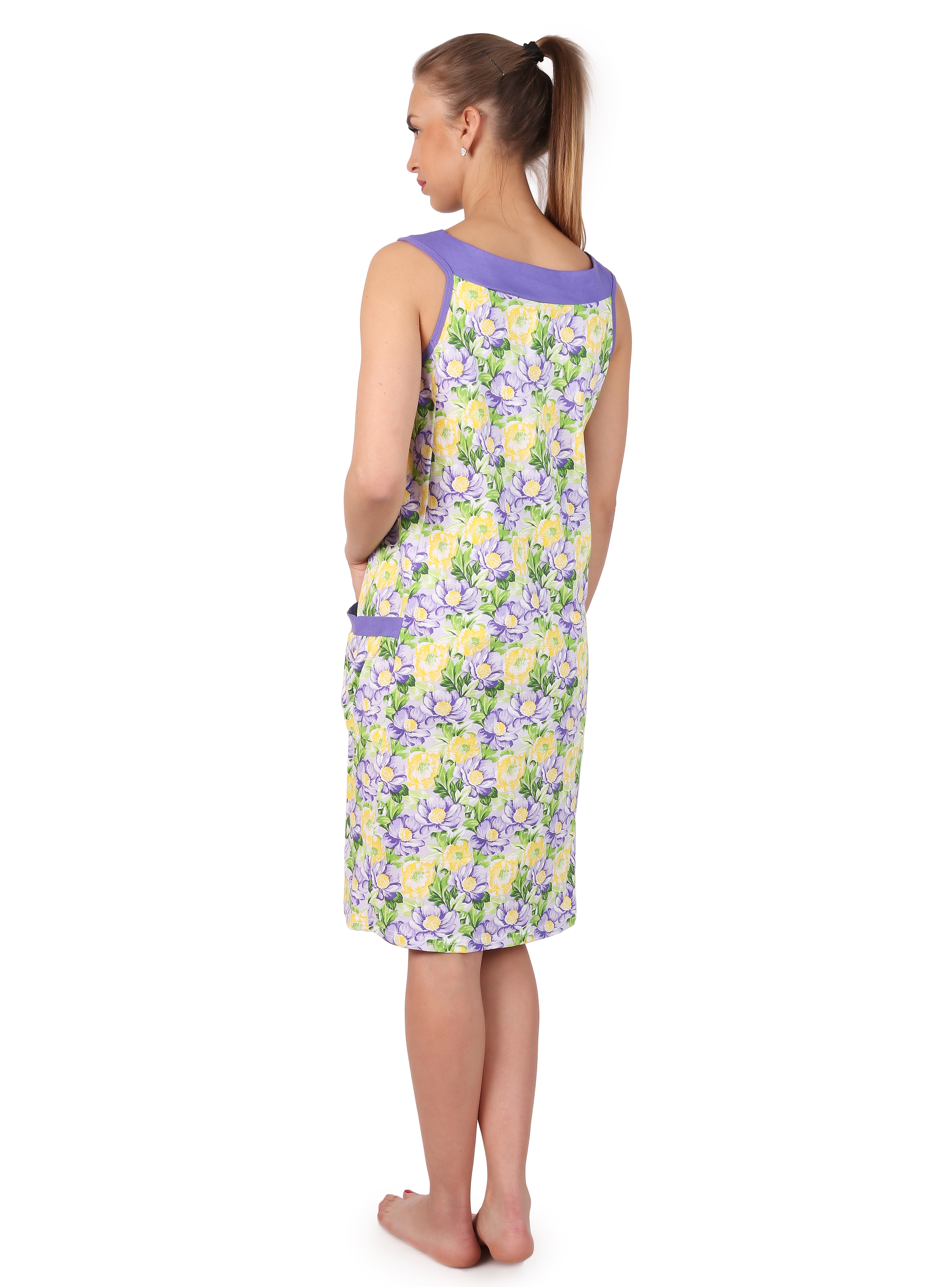 Безрукавное летнее платье с контрастной окантовкой горловины и боковых карманов. Свободный поркой позволяет носить эту модель с любым типом фигуры.